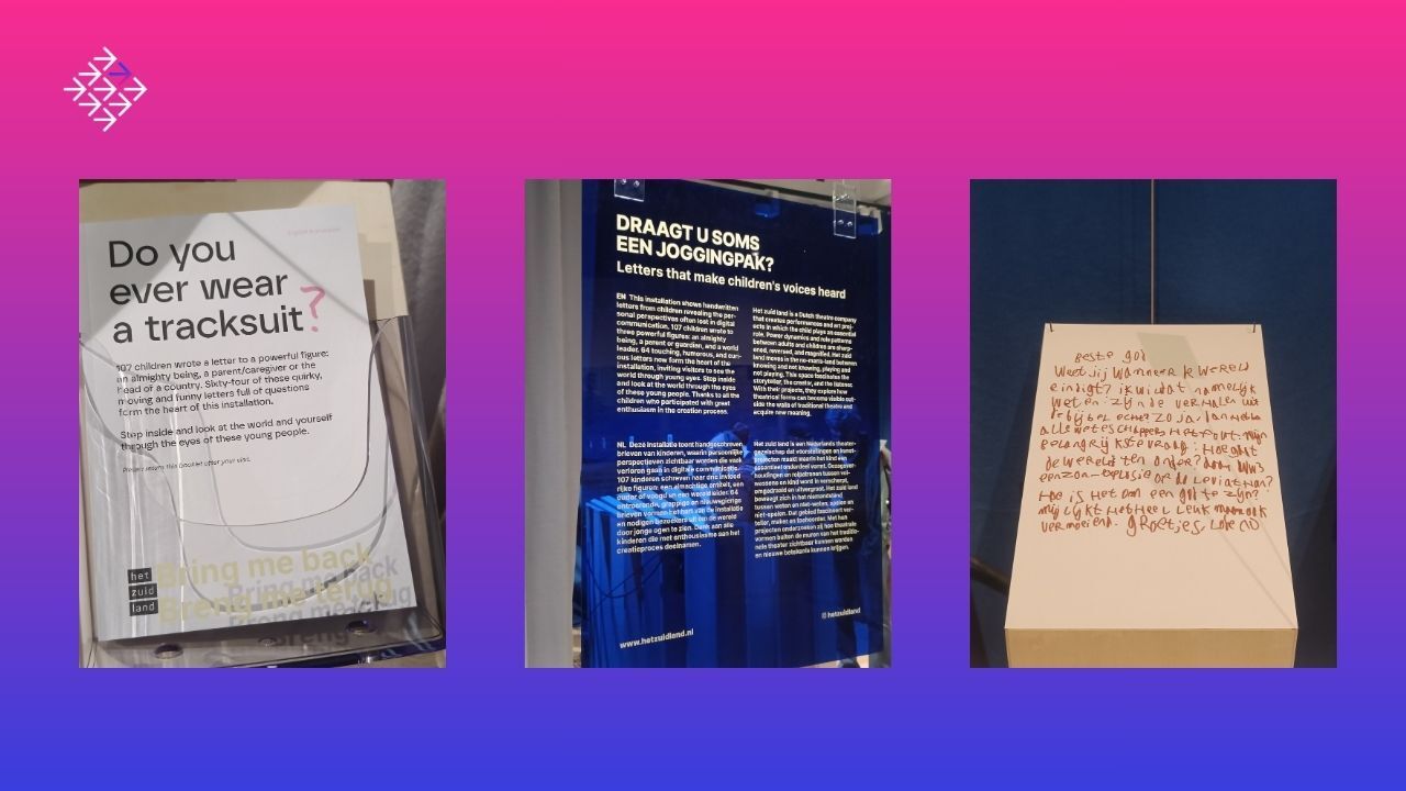 Carlijn: In het kunstproject ‘Draagt u soms een joggingpak?’ van theatergezelschap Het zuid land, geven handgeschreven brieven van kinderen een andere kijk op de wereld. Een handgeschreven brief maakt persoonlijke perspectieven zichtbaar en vormt een oprecht en authentiek gebaar in een wereld die steeds meer digitaal wordt.