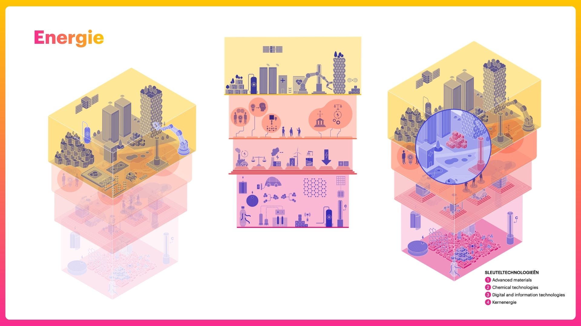 Het eindresultaat is een visueel model met vier lagen per transitie, bewust hiërarchisch opgebouwd: bovenaan de meest zichtbare laag: het domein waar de transitie zich bevindt. Daaronder de lagen die ondersteunen of ondermijnen: technologie, mens en beleid. "Dit geeft mensen de vrijheid om in te zoomen op wat voor jou telt, een soort cherry picking voor relevantie."